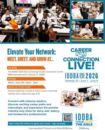 Who should attend? Anyone age 16 and up who’s exploring or curious about a current or future career in the food industry is invited to join us for networking and professional development. Schools, programs, clubs, etc. interested in learning more or would like to bring a group please email Michele Tietyen at education@iddba.org. If you are an individual student, please complete the student application. If you are an exhibiting company interested in being involved complete the Host a Career Connection Live Stop application.